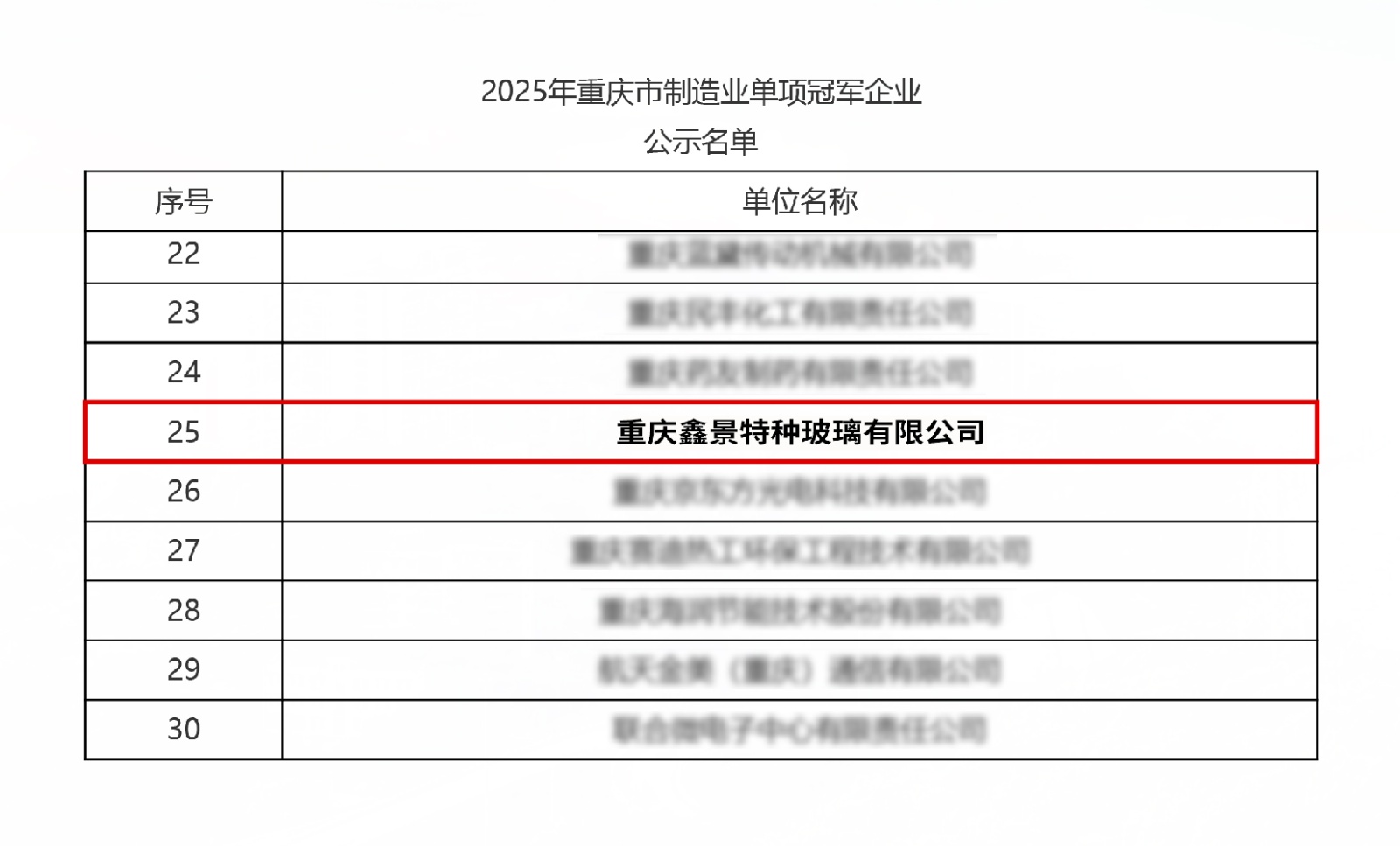 7月18日,市經(jīng)信委公示了2025年“重慶市制造業(yè)單項冠軍企業(yè)”名單,鑫景憑借在特種玻璃新材料領(lǐng)域的卓越表現(xiàn)成功入選,成為全市制造業(yè)高質(zhì)量發(fā)展的標(biāo)桿企業(yè)之一。